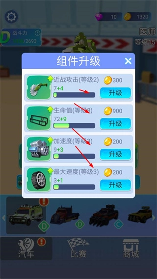 玩家能够对赛车的各个组件进行升级操作,通过消耗金币来提升诸如近战攻击、生命值、加速度、最大速度之类的属性。