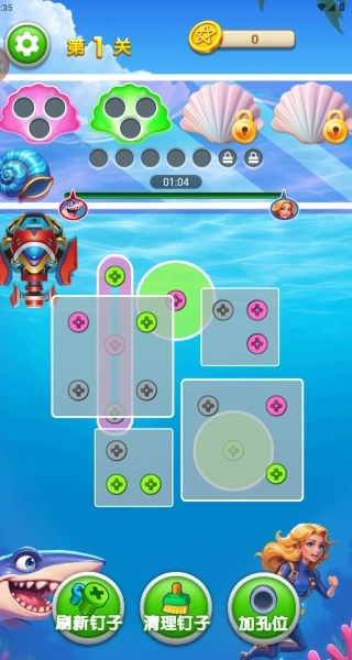 1、观察螺丝的颜色与位置分布,点击拆除对应的螺丝并放入同色收纳盒,当积累到指定数量时,即可触发消除特效,进而形成连锁反应。