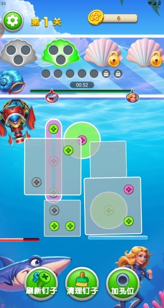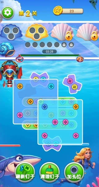 1、关卡开启后,先统计好不同颜色螺丝的数量,优先消除数量占优势的颜色组,同时配合“刷新钉子”功能来调整螺丝的位置,以此提升同色螺丝的匹配成功率。