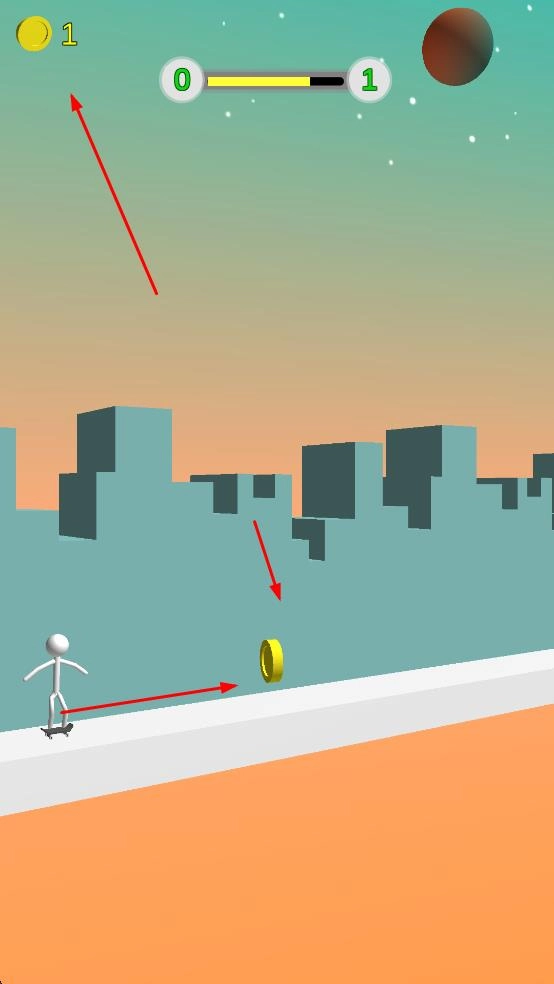 角色滑行时要注意避开障碍物,同时尽可能多地收集金币,屏幕上方会显示当前收集到的金币数量。