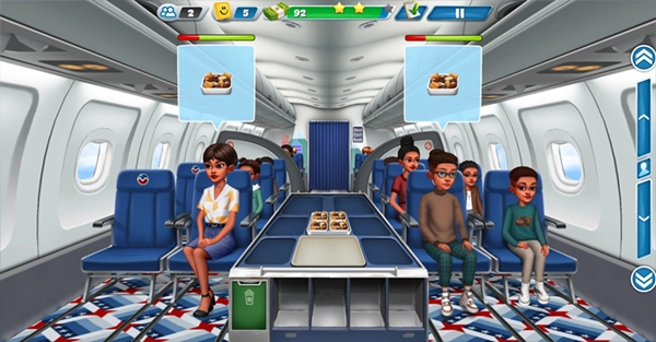 7、关于笑脸积分,送餐和回收餐盘这两项服务都能获得笑脸,但如果回收餐盘不及时就拿不到了。所以,要是你送餐的时间比较充裕,建议先去收餐盘再送餐,或者两者交替进行,只要看到有需要回收的餐盘就马上处理。另外,在等待顾客点餐的间隙,可以多在机舱里走动走动,这样更容易遇到需要耳机、毯子等物品的乘客,笑脸积分就能攒得更快一些。
