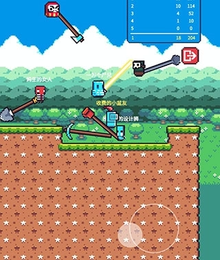2、像素风格场景,几十种铁锤外观角色造型可以自由搭配,炫酷操控,灵活走位,将你对手推出场景外。