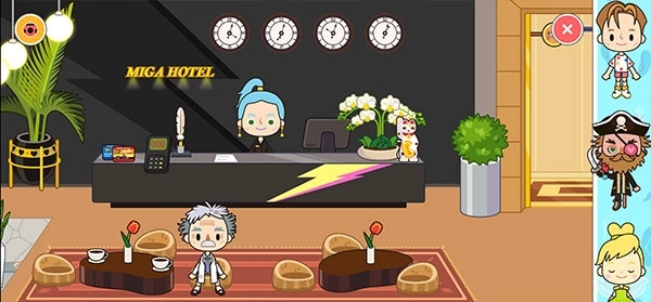 -6个场景:家,度假区(酒店大厅,豪华套房,2个主题房间),海滩小岛,观光区