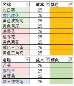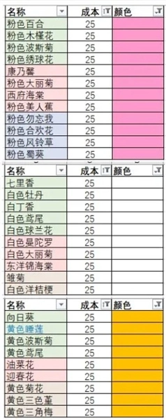 花的收获值会随价格变动而改变,例如单价25的花种,其收获值在五到八之间浮动——若在对应季节种植就能达到上限八,而在其他季节种植则固定为五。以下是不同价格花种各自对应的收获值情况。