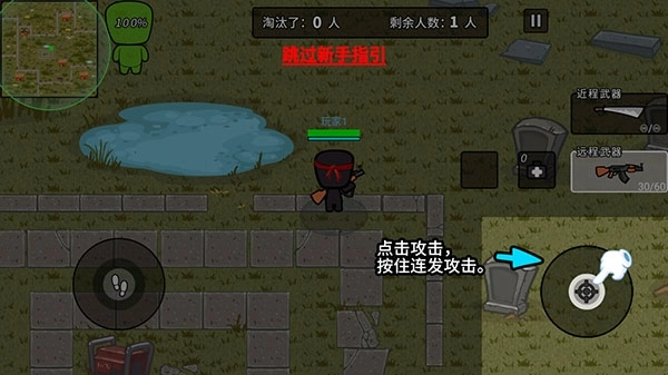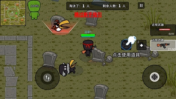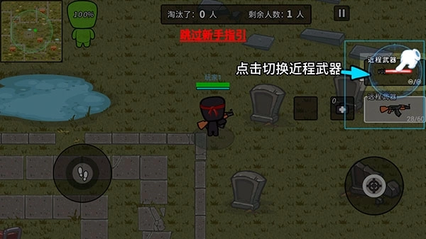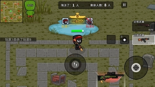 3、降落到地面后,拖动左侧摇杆可控制角色移动,上方小地图里的绿色圈是安全区,圈外则是中毒区域。