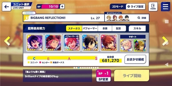 这是和歌曲配色不同的队伍搭配方法,总战力是681270。