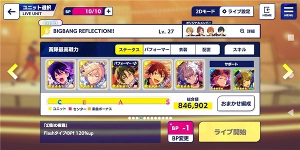 假设我要打「BIGBANGREFLECTION!!」且该歌曲属性为「Flash(黄色)」,那么原则上我选择成员时就应该以「Flash属性」的卡片作为标准。