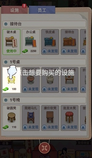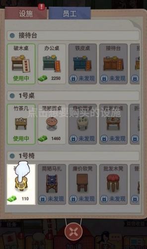 4、购买椅子让顾客能坐下来慢慢聊。同样的操作方式,点击购买椅子即可。