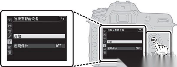 2、相机端设置:在照相机设备的设定菜单中,选择 “连接至智能设备”,接着加亮显示 “开始” 并按下 OK 键。