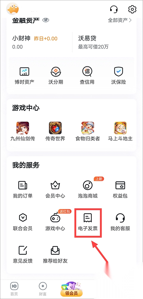 1、当你打开沃支付app,进入“我的”界面,接着把页面一直滑动到最底部,这时你会看到“我的服务”,点击“我的服务”中的“电子发票”选项。