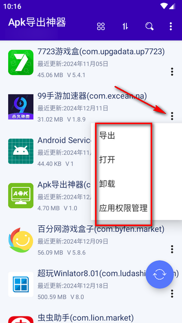 1. 首先在本站下载并安装好最新版本的Apk导出神器,打开软件后,长按便能弹出功能选项。