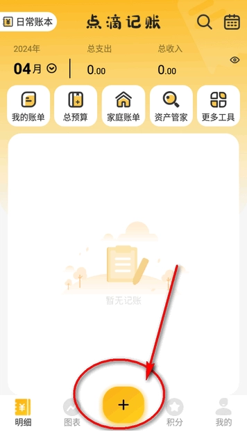 1首先,在设备上找到并打开点滴记账App。进入App主页后,留意页面下方,点击其中的“积分”选项。