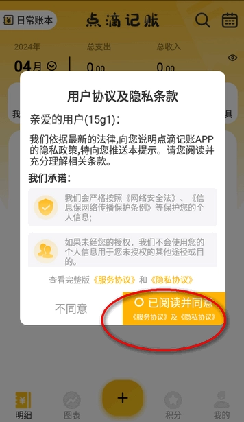 1. 开启点滴记账App,进入应用后点击“已阅读并同意”