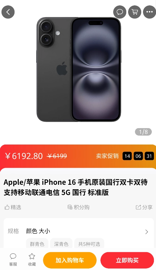 2、点击商品进入详情页,查看规格、评价等信息后点击"立即购买"下单。