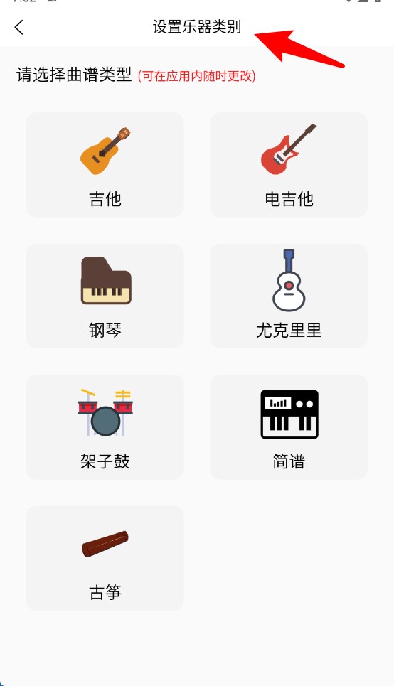 1. 在“设置乐器类别”的页面上,能够挑选吉他、电吉他等各类曲谱,以契合个性化的学习需求。