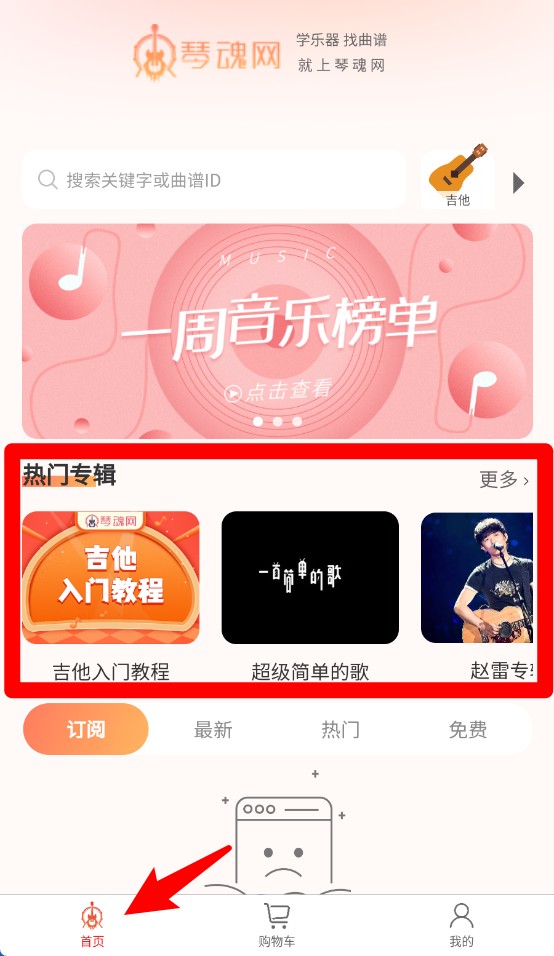 2. 首页呈现音乐榜单以及热门专题,像吉他入门教程这类,方便新手能迅速寻得学习入口。