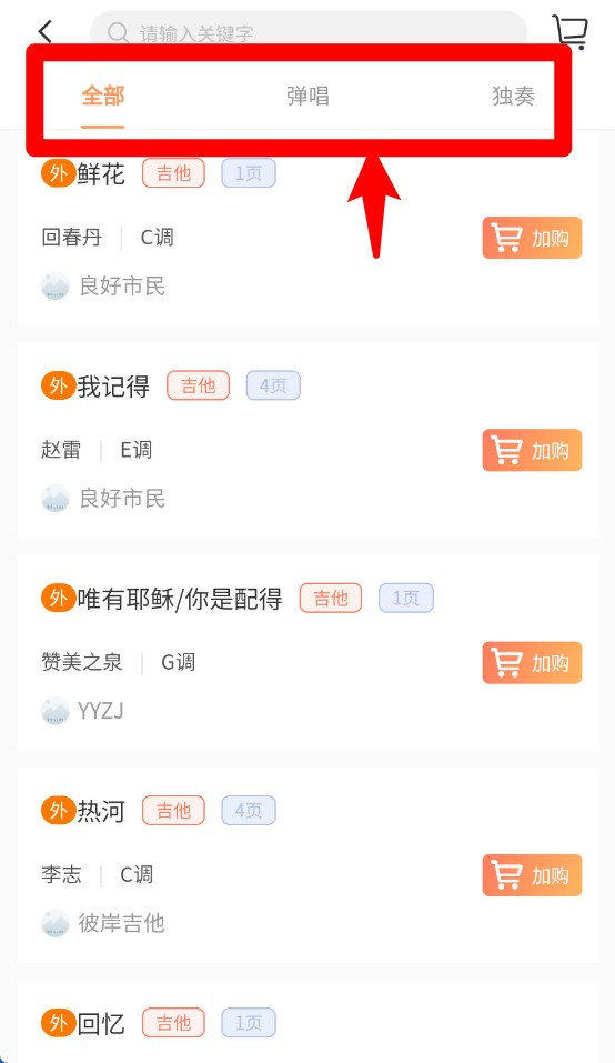 3、在曲谱列表页,具备分类筛选功能。通过弹唱、独奏这两种分类方式,能快速找到所需演奏形式的曲谱。