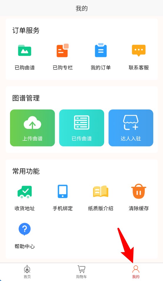 4、于“我的”页面,用户能够对订单进行管理、上传曲谱以及完成达人入驻等操作,为用户实现个性化操作提供便利。