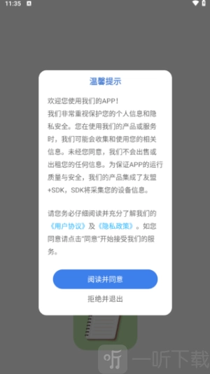 1. 打开软件后,能够查看用户协议及隐私政策,点击同意便可开启使用。