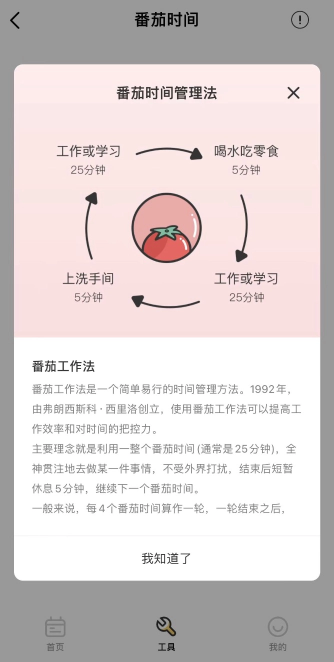 - 番茄时间:提升工作、学习的专注力,高效番茄工作法的实用工具。可以根据您的专注力集中时长差异对番茄钟进行调整。
