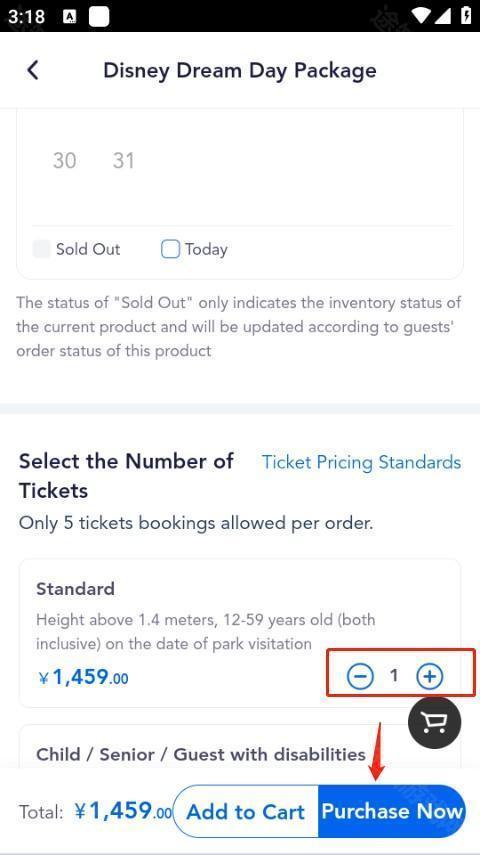 5、接下来确定好时间日期,向下滑动页面,添加购票数量,点击“Purchase Now”进行立即购买,完成付款后,门票预订就成功啦。