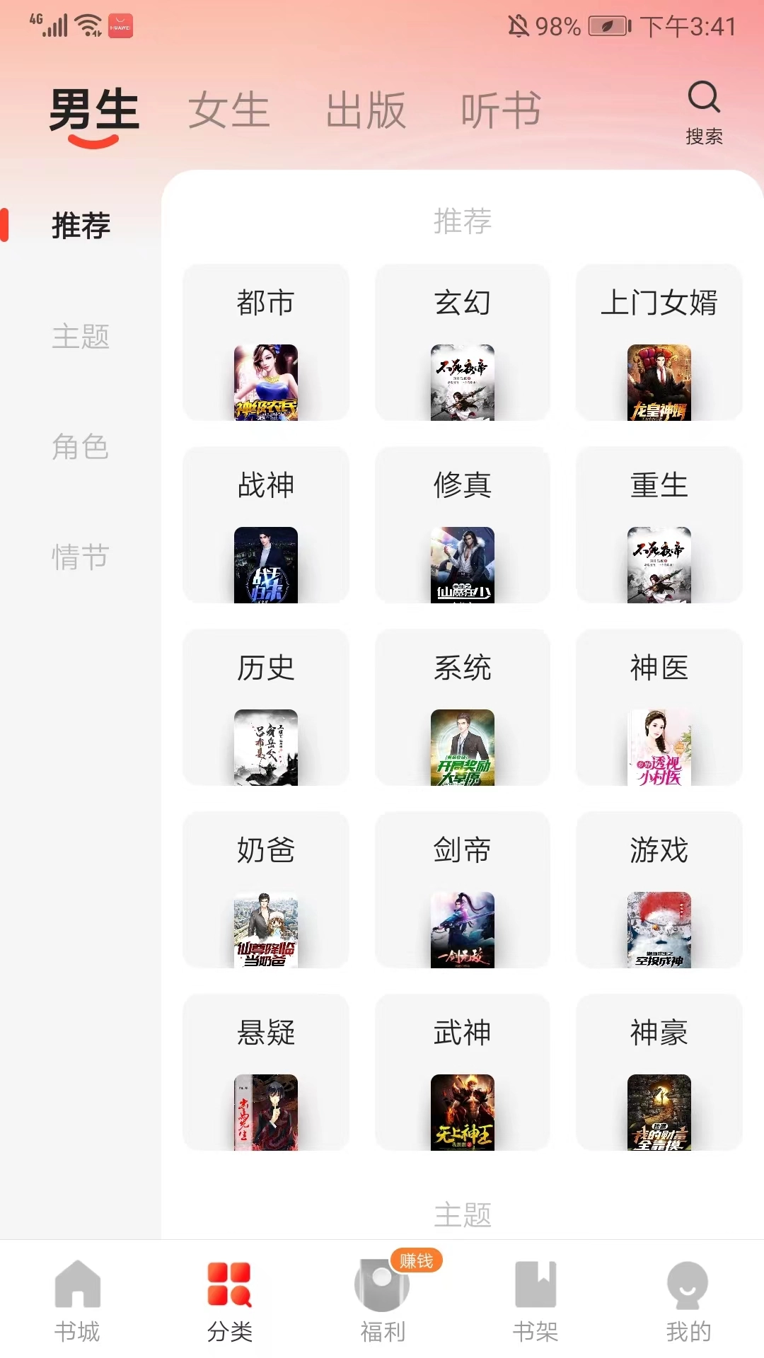 7、来到分类界面,该界面涵盖推荐、主题、角色、情节等多种不同类别。