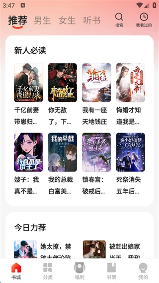 2、于书城界面,设有推荐、男生、女生以及听书等分类,大家能够挑选自己感兴趣的分类。