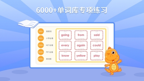 4000+单词库专项练习,对标国内教学要求;含108启蒙词、220高频词、300+小学词汇、1000+KET词库、2000+PET词库;2000+拓展词库;通过“学、练、认”科学学习路径设计,让儿童牢记4000+常用词;