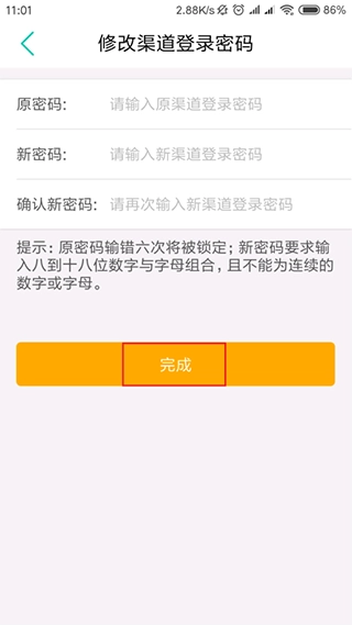3、进入打开的密码修改页面,依次输入原登录密码与新密码,确认无误后,点击“完成”按钮即可。