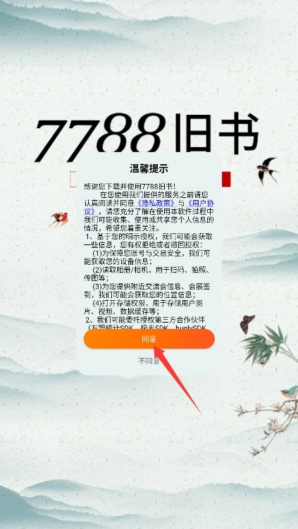 首次使用本应用前,请仔细阅读平台的服务条款和隐私政策,确认无误后点击“同意”按钮即可进入应用。