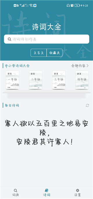 点击诗词大全,可以查看中小学必学的诗词。