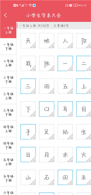 点击小学生字表大全,就能选择年级查看推送的生字。