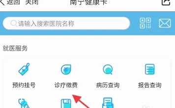 进入南宁健康卡后,找到页面下方的就医服务板块,点击进入医疗缴费页面,查看相关缴费信息后完成缴费操作。