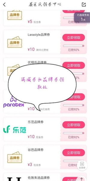 在屈臣氏领券中心的下方区域,还可以领取到用于秒杀活动的满减券,以及不少知名品牌的优惠券。