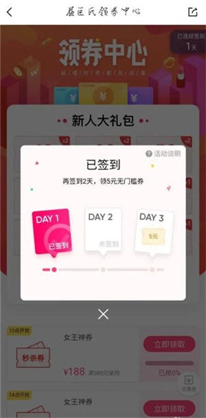 二、在屈臣氏的领券中心页面,只要连续签到满三天,就可以领取一张5元的无门槛优惠券。
