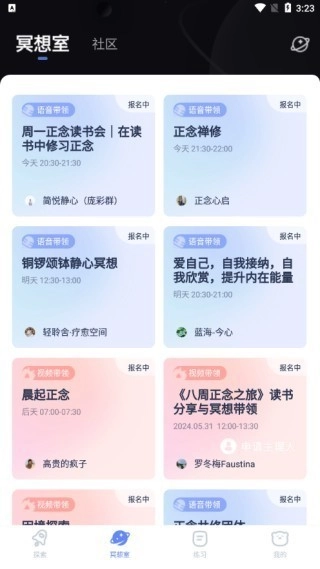 用户可在此板块查看多个冥想室,挑选心仪的房间开启冥想之旅。