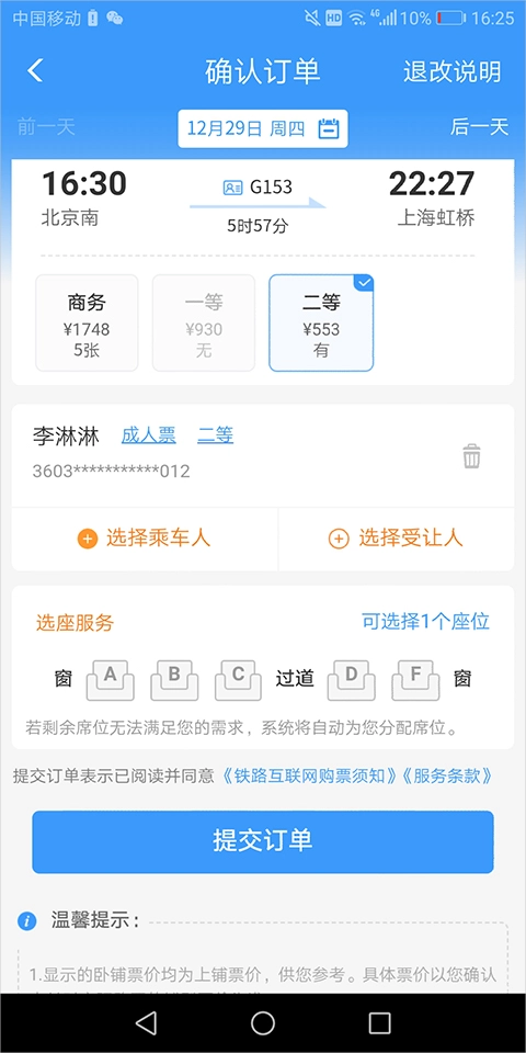 选好乘车人后,点击页面右上角的【完成】按钮,回到【确认订单】页面。要是想在线选座,就在【选座服务】区域挑选座位;若无需选座,直接点击【提交订单】完成支付就行。