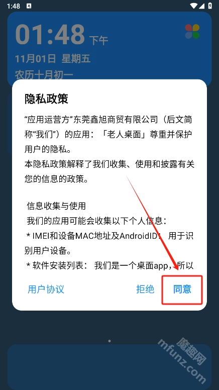 首先在魔趣网并安装老人桌面,点击“同意”进入软件