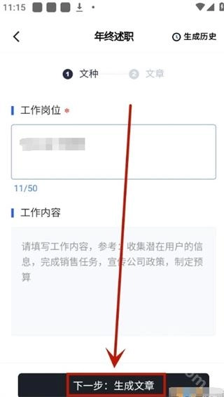 在创作页面把工作岗位和具体工作内容详细填写好,之后点击“生成文章”按钮,系统就会自动生成满足要求的文章。