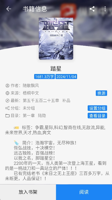 接着点击“加入书架”按钮,就能把小说添加到软件的书架里;点击“阅读”按钮,则可以在线阅读这本小说。