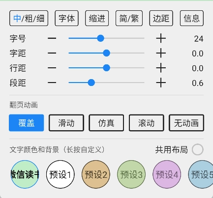 进入阅读界面后,轻点屏幕中间区域即可调出阅读设置面板,其中包含朗读功能、字体样式、背景颜色等一系列个性化配置选项。