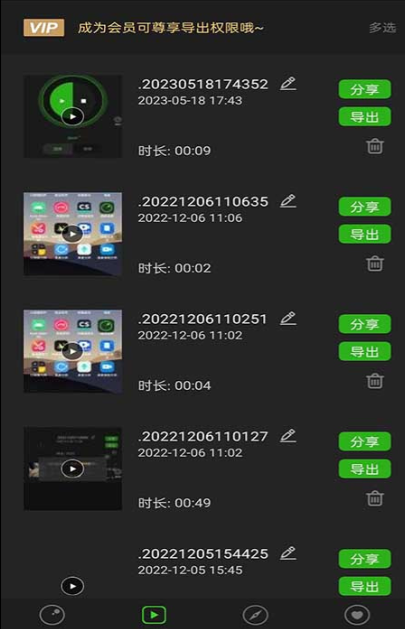 录制结束后,可对视频进行分类选择,进而执行分享、导出或删除操作。