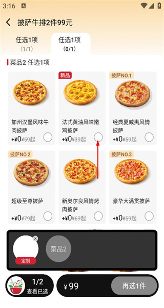 3、进入菜品2的选择页面后,挑选法式黄油风味嫩鸡披萨,该界面提供了多种不同风味的披萨供选择。