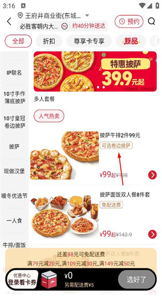 打开软件后,能看到特惠披萨与披萨牛排2件99元的套餐入口,点击这个套餐后,界面上还显示着现做汉堡、一人食等分类选项。
