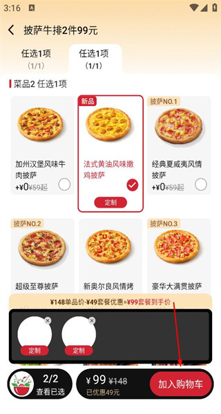 4、挑选好两款披萨后,点击加入购物车,完成套餐的选择,界面随即会显示相关的优惠信息。