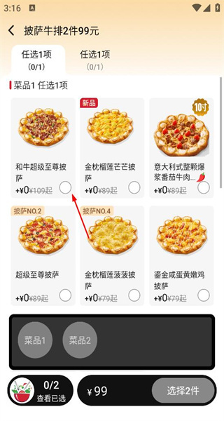 2、进入披萨牛排套餐的菜品1选择界面后,选定和牛超级至尊披萨;该页面还陈列了多款新品及人气披萨,大家可根据自身需求进行挑选。