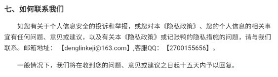 若您在个人信息安全方面有投诉或举报需求,或是对本《隐私政策》、您的个人信息相关事宜存在任何疑问、意见或建议,亦或是关于本《隐私政策》或记账鸭隐私措施的问题,欢迎与我们取得联系。联系方式如下:邮箱地址为【denglinkeji@163.com】,客服QQ为【2700155656】。