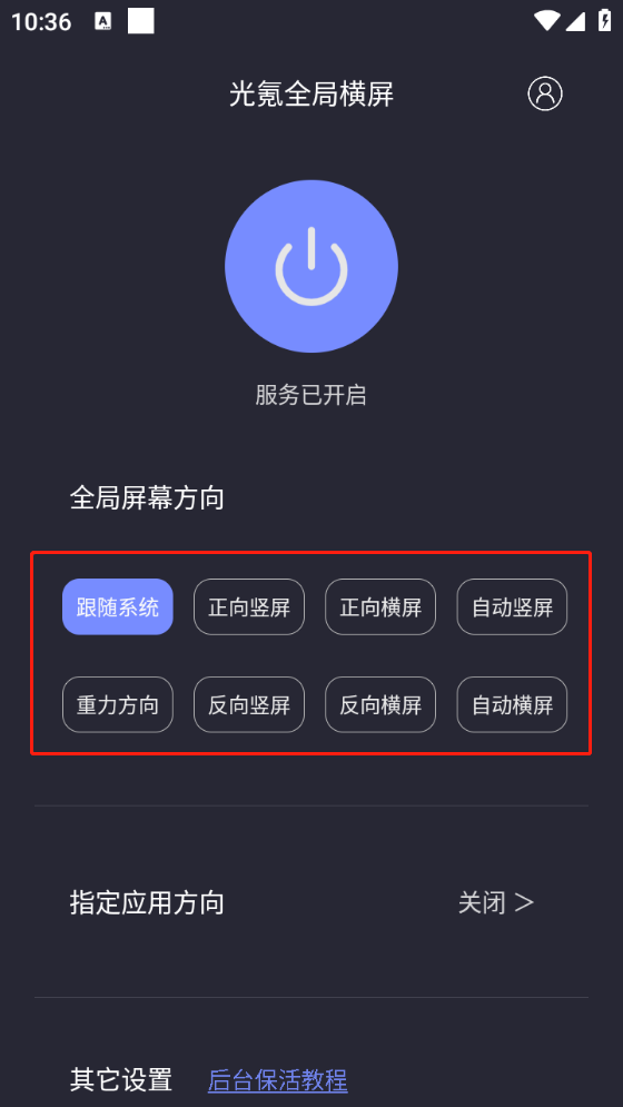 3、开启之后,可以根据自身需求设置全局屏幕方向。