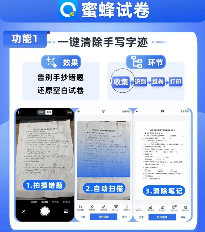 2、拍试卷:自动清除笔迹,完美还原空白试卷