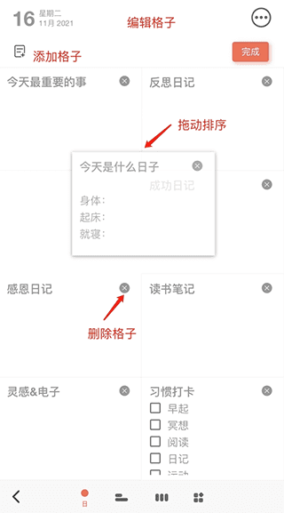 2. 可删除或排序格子,适应个人记录习惯。